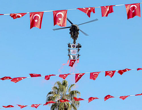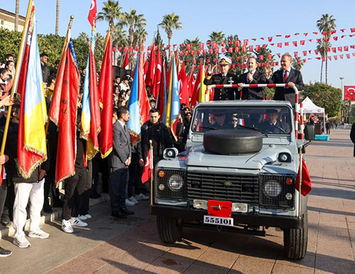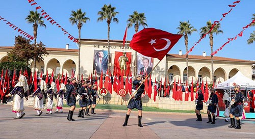 Törende Büyükşehir Belediye Başkanı Vahap Seçer ve Akdeniz Bölge ve Garnizon Komutanlığından Deniz Üsteğmen Yavuz Kaya da günün anlam ve önemini belirten konuşmalar yaptı. Kutlama törenleri, öğrenciler tarafından okunan şiirlerin ardından Maarif Halk Dansları, Büyükşehir Belediyesi Halk Oyunları ekibi ve Jandarma Merasim Bölük Komutanlığı’nın tüfekli hareketler gösteriyle devam etti. Kutlamalar, Jandarma Özel Asayiş Komutanlığı tarafından helikopterle gerçekleştirilen ve uzun uzun alkışlanan ‘Üzüm Salkımı’ gösterisiyle sona erdi.